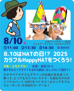 今年2025の 8.10HATの日 は、ゲストアーティストにイラスト作家カタヤマアヤナさんをお招きし、カタヤマさん作のオリジナルデザイン台紙に自由に色を塗って、飾って、とってもカラフル・ステキな自分だけのオリジナルハット(HAT)をつくります!ぜひご参加ください!!